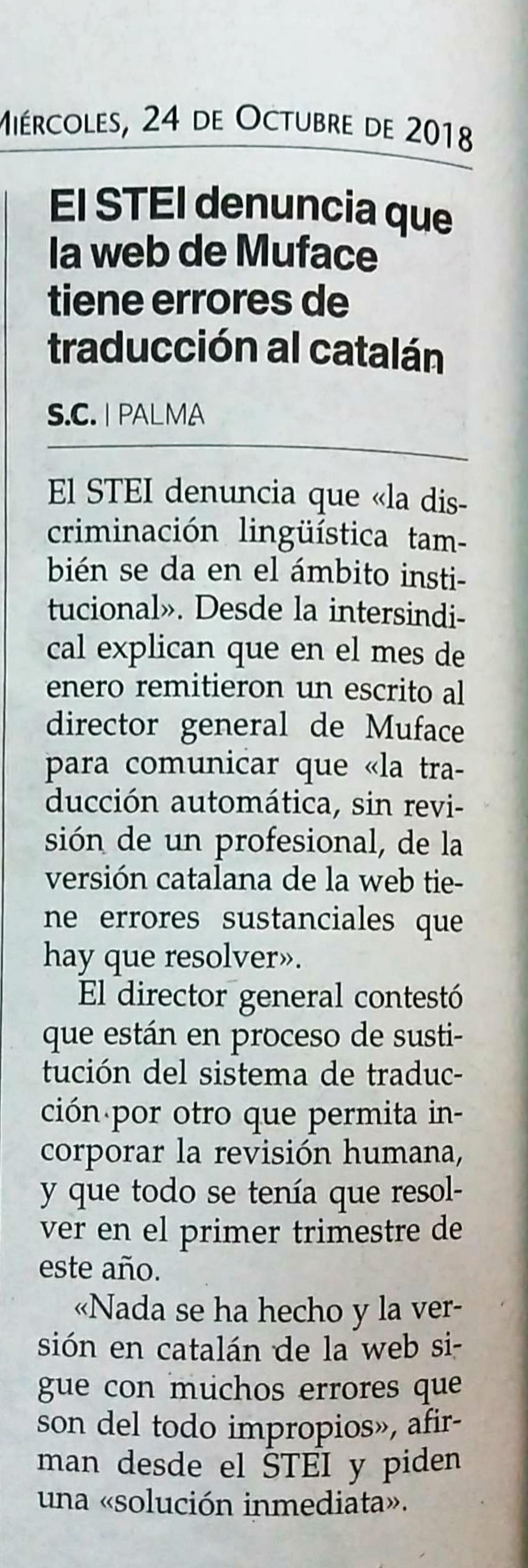 El mes de gener vàrem remetre un escrit al Director General de MUFACE comunicant-li que la traducció automàtica, sense revisió d’un professional, de la versió en català de la web tenia moltes errades substancials que calia resoldre.